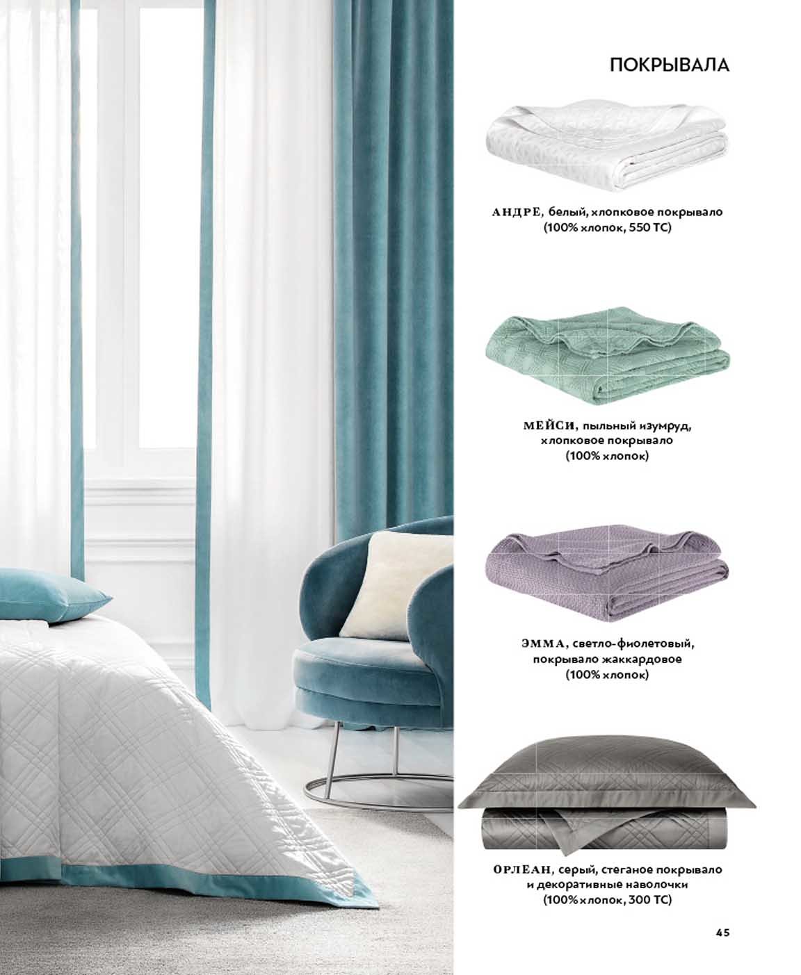 В ассортименте теплые пуховые и шерстяные одеяла, декоративные и ортопедические подушки для здорового отдыха, покрывала всевозможных форм и расцветок, уютные пледы из кашемира, плотного хлопка и шелка, постельное белье Тогас из элитного сатина и шелка, которое станет настоящим украшением вашей спальни.